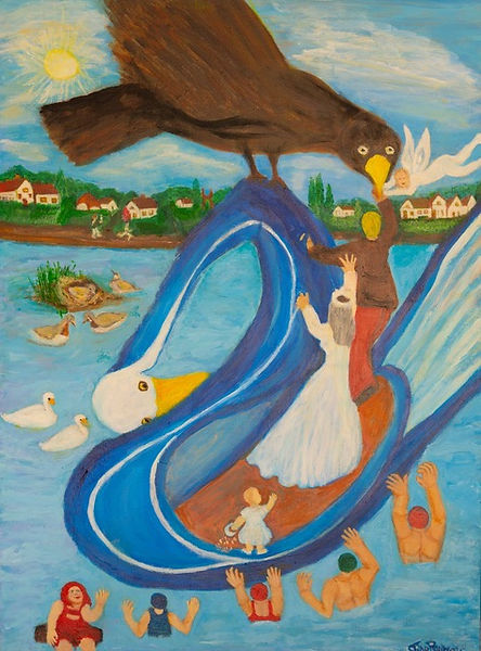 Een grote plastic zwaan met een bruidspaar en een bruidsmeisje. Daar komt een grote vogel op af en die prikt in de zwaan . Bruidegom probeert het te redden maar hij is te laat. Zijn hand zit in de bek van de vogel. Daar komt de reddende engel aan en die wil haar hand ook in de bek van de grote vogel steken. Gelukkig het reddingsteam ligt klaar in het water.